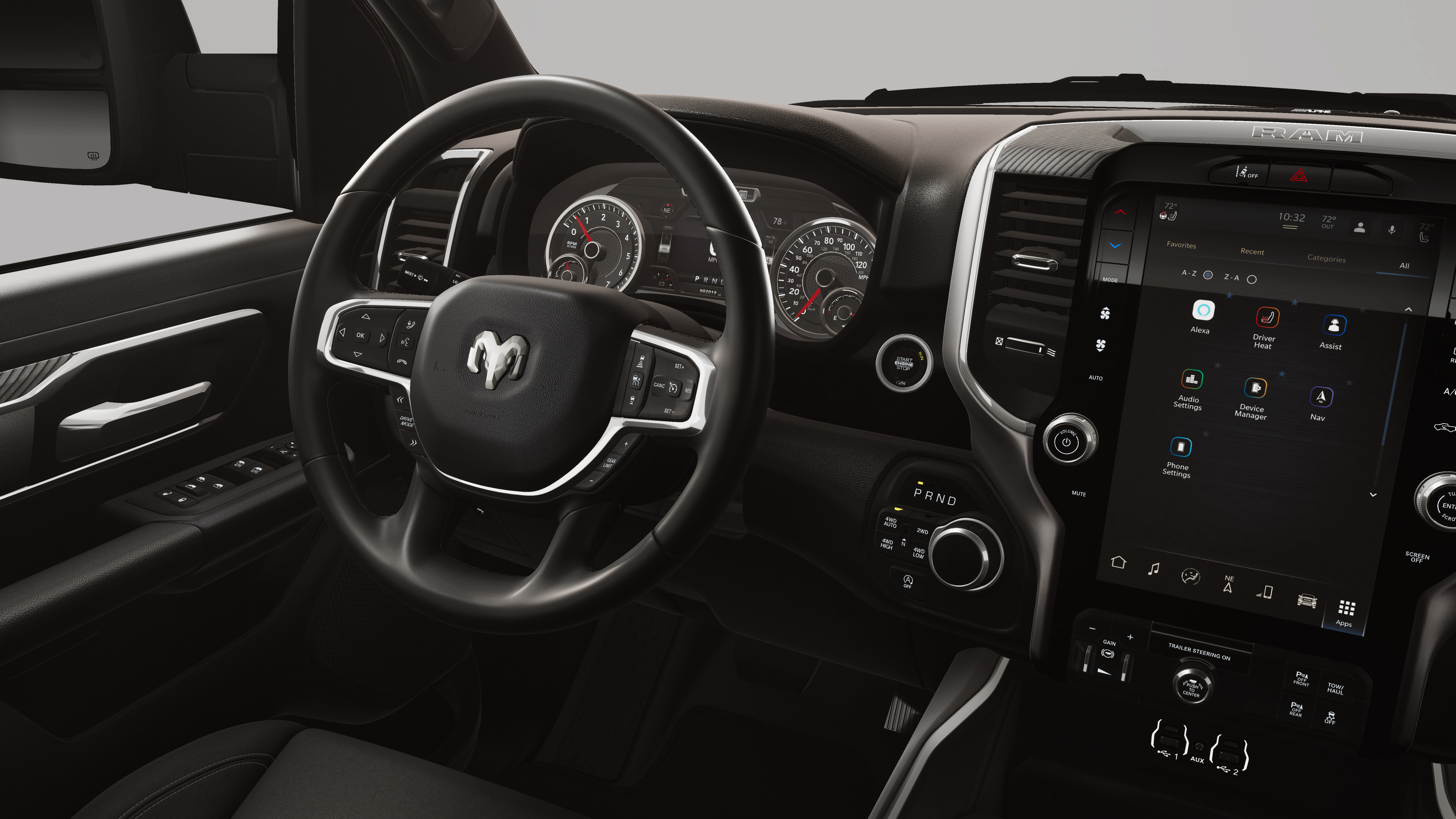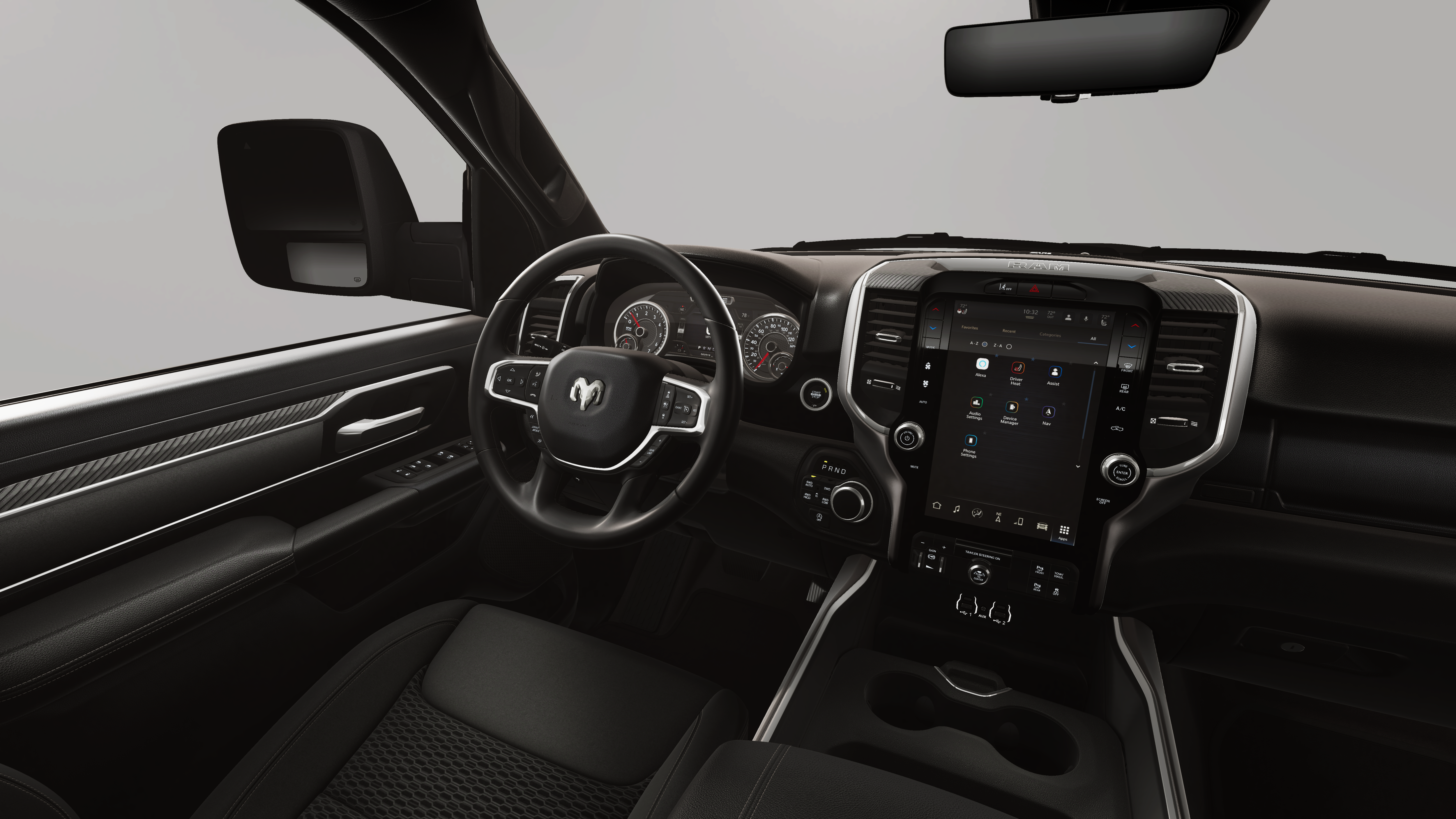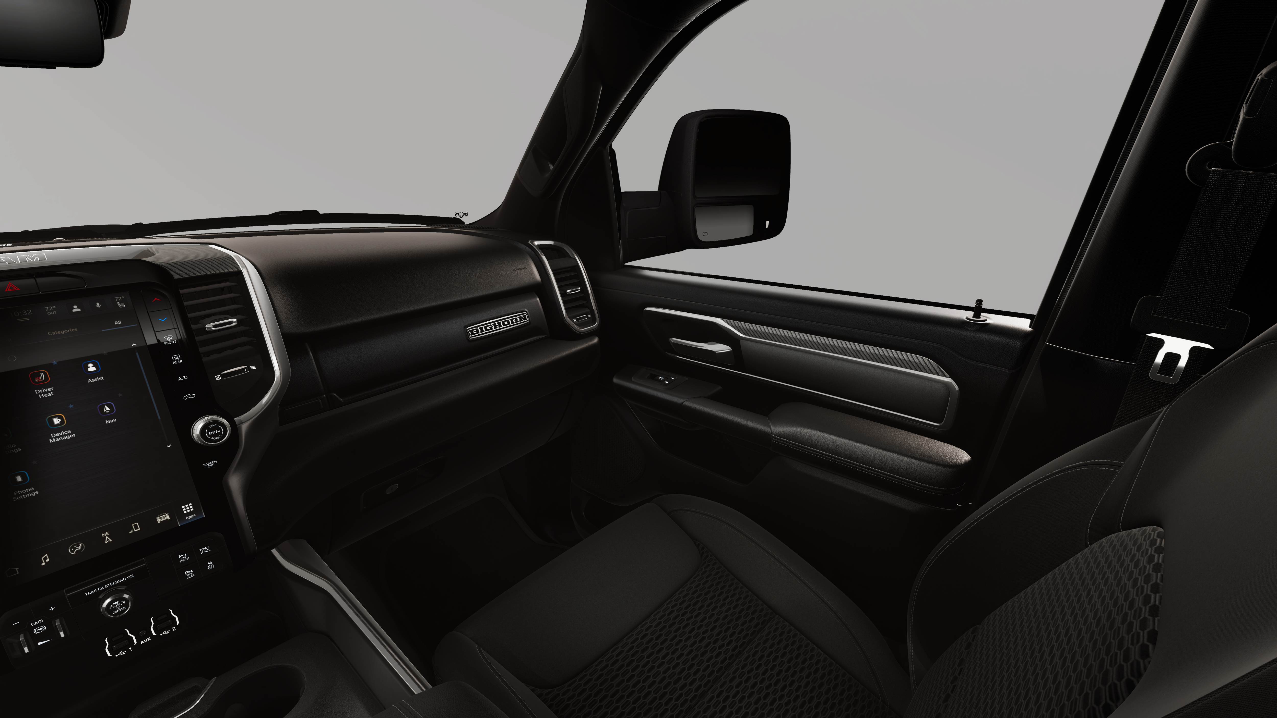 BIG HORN LEVEL 2 EQUIPMENT GROUP SiriusXM Radio Service, Power Adjustable Pedals, Leather Wrapped Steering Wheel, 12 Touchscreen Display, Glove Box Lamp, Auto Power-Folding Mirrors, 115V Auxiliary Rear Power Outlet, Media Hub w/2 Charge Only USBs, Heated Front Seats, Security Alarm, Black Premium Power Mirrors, Premium Overhead Console, 9 Amplified Speakers w/Subwoofer, Disassociated Touchscreen Display, Body Color Fender Flares, Remote Tailgate Release, 115V Auxiliary Power Outlet, LED Dome Lamp w/On/Off Switch, Universal Garage Door Opener, 2nd Row In Floor Storage Bins, Sun Visors w/Illuminated Vanity Mirrors, LED Footwell Lighting, Rear Window Defroster, Rear View Auto Dim Mirror, Rear Power Sliding Window, GPS Navigation, Overhead LED Lamps, Wheels: 20 x 9 Aluminum Chrome Clad, ENGINE: 3.0L I6 HURRICANE SO TWIN TURBO ESS Aux Battery, 700 Amp Maintenance Free Battery, Active Noise Control System, GVWR: 7,100 lbs, 3.55 Rear Axle Ratio, Dual Rear Exhaust w/Bright Tips, Start-Stop Dual Battery System, 230 Amp Alternator, NIGHT EDITION Tires: 275/55R20 OWL All Season, Bridgestone Brand Tires, Accent Color Premium Power Mirrors, Exterior Mirrors w/Supplemental Signals, Black Headlamp Bezels, Exterior Mirrors Courtesy Lamps, Grille Black Surround Black Mesh, Auto Power-Folding Mirrors, Wheels: 20 x 9.0 Aluminum Painted Clad, Auto Dim Exterior Driver Mirror, Black Exterior Truck Badging, Anti-Spin Differential Rear Axle, Accent Color Door Handles, Accent Color Tailgate Handle, Black Interior Accents, Dual Exhaust w/Black Tips, Body Color Front Bumper, Body Color Rear Bumper w/Step Pads, Black Tail Lamp Bezels, RAM Grille Badge - Black, Black Painted Exterior Mirrors Caps, TRANSMISSION: 8-SPEED AUTOMATIC (8HP75).