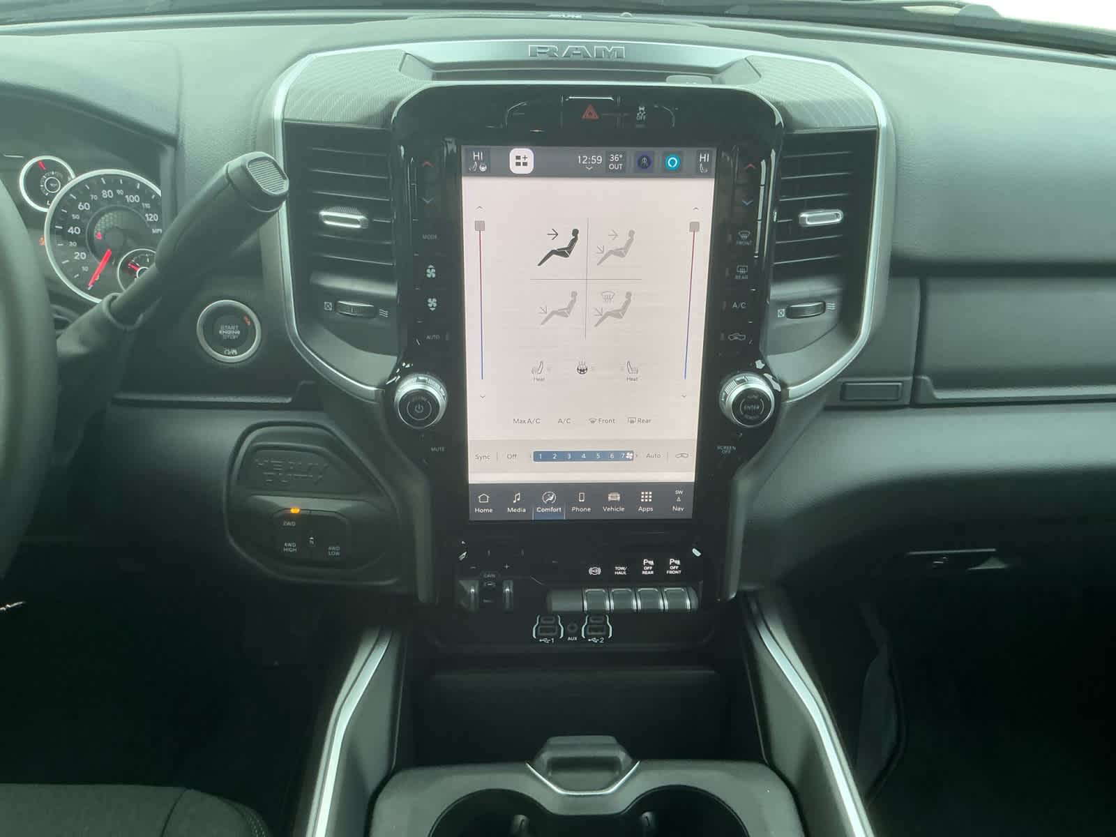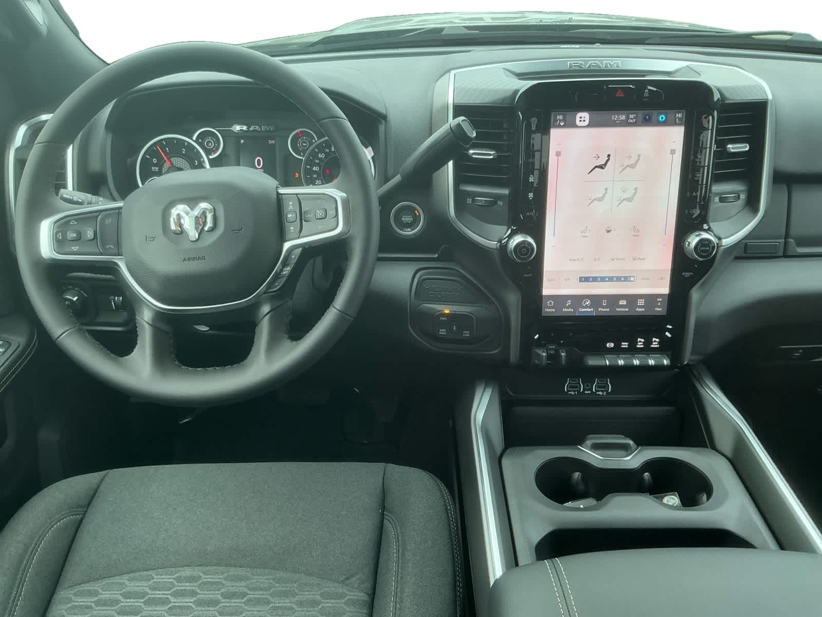 ENGINE: 6.7L I6 CUMMINS HO TURBO DIESEL Selective Catalytic Reduction (Urea), Dual 730 Amp Maintenance Free Batteries, Cummins Turbo Diesel Badge, Heavy Duty Engine Cooling, Diesel Exhaust Brake, Supplemental Heater, 3.42 Axle Ratio, Front Bumper Sight Shields, Capless Fuel Fill w/o Discriminator, GVWR: 11,040 lbs, BIG HORN LEVEL 1 PLUS EQUIPMENT GROUP Emergency Vehicle Alert System (EVAS), 12 Touchscreen Display, Glove Box Lamp, Auto Power-Folding Mirrors, Footwell Courtesy Lamp, Anti-Spin Differential Rear Axle, MOPAR Deployable Bed Step, Alexa Built-In, Forward & Reverse Utility Lights, Locking Lower Glove Box, Remote Start System, 9 Alpine Speakers w/Subwoofer, Disassociated Touchscreen Display, Dual Glove Boxes, 2nd Row In Floor Storage Bins, Rear View Auto Dim Mirror, Rear Dome w/On/Off Switch Lamp, LED Bed Lighting, GPS Navigation, SiriusXM w/360L, Connected Travel & Traffic Services, Foam Bottle Insert (Door Trim Panel), Big Horn IP Badge, Off-Road Info Pages, Trailer Tow Pages, HD Radio, Radio: Uconnect 5 Nav w/12.0 Display, Power Heated Folding Telescopic Mirrors, Steering Wheel Mounted, NIGHT EDITION Gloss Black Nostrils/Mic Black Grille, Tires: LT285/60R20E OWL On/Off Road, Black Exterior Truck Badging, Wheels: 20 x 8.0 Black Painted Aluminum, Body Color Grille-Surround, Black Interior Accents, Black Wheel Center Hub, Painted Front Bumper, Painted Rear Bumper, PAINTED FLAT WHEEL-TO-WHEEL SIDE STEPS, HEATED SEATS & WHEEL GROUP Heated Steering Wheel, Heated Front Seats, BLACK, PREMIUM CLOTH BUCKET SEATS Bucket Seats, Power Adjust 8-Way Driver Seat, Folding Flat Load Floor Storage, Rear 60/40 Folding Seat, Front Seat Back Map Pockets, Power 2-Way Driver Lumbar Adjust, Full Length Upgraded Floor Console, TRANSMISSION: 8-SPEED TORQUEFLITE HD AUTOMATIC.